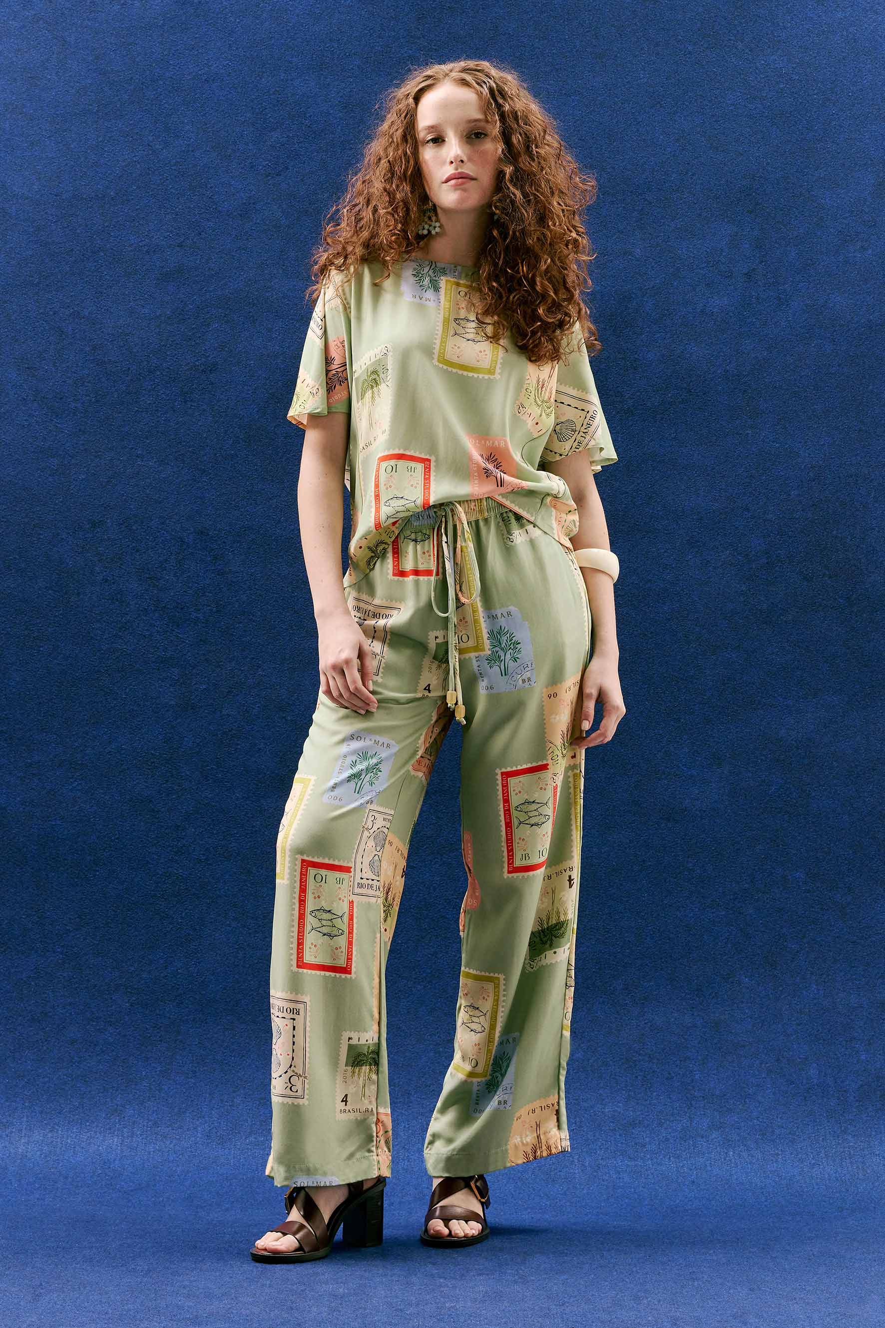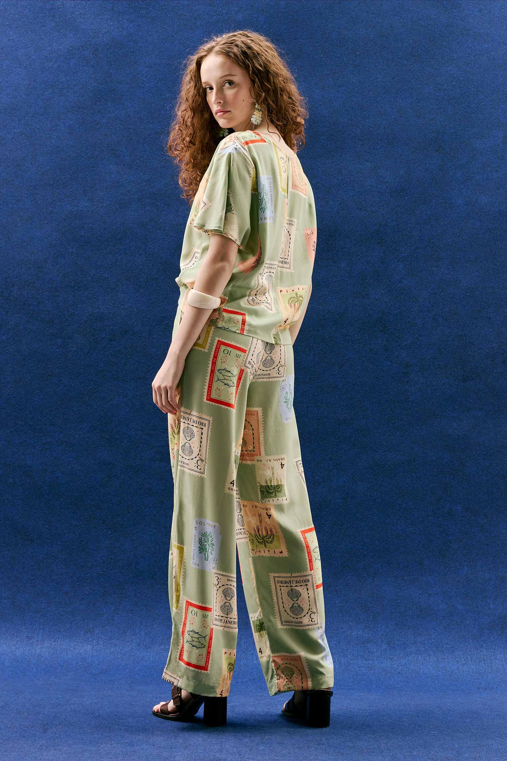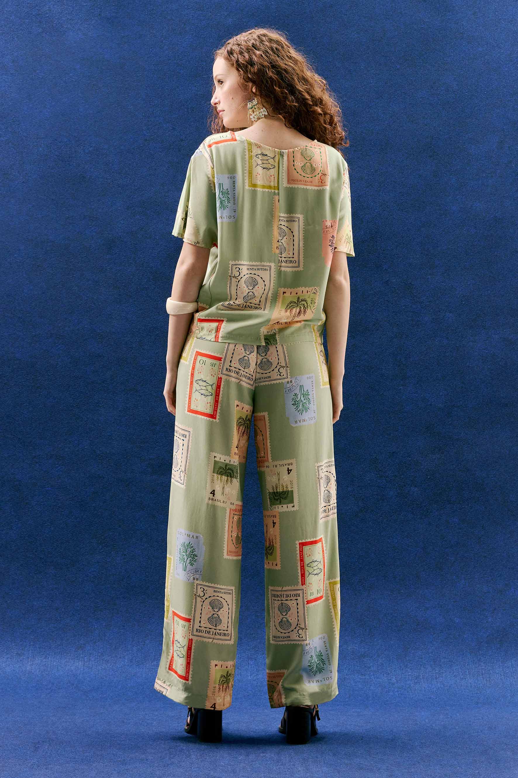 Descubra a versatilidade da Calça Duda, agora em uma versão lúdica e cheia de encanto com a estampa Selos. Pequenos selos ilustrados com conchas, peixinhos e estrelas-do-mar se espalham pelo fundo verde delicado, como pequenas memórias do verão guardadas no tecido, trazendo frescor, alegria e poesia a cada detalhe.